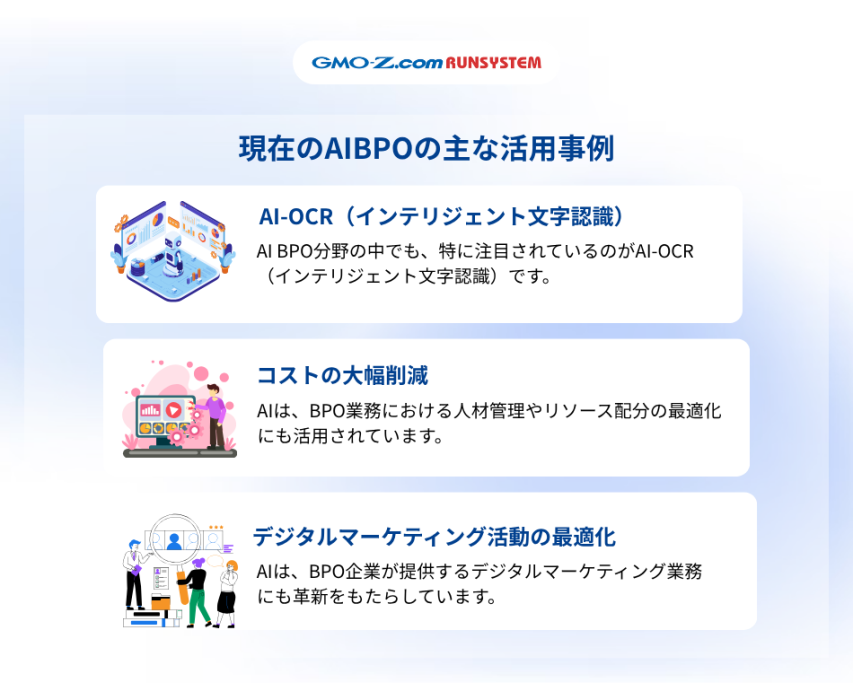 ここでは、ビジネスプロセスアウトソーシング(BPO)の現場で実際に活用されている、AIの代表的な応用例をご紹介します。