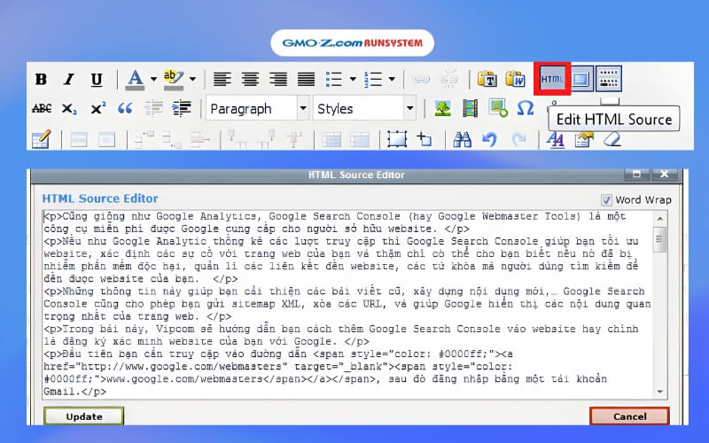 • Trong giao diện soạn thảo bài viết, nhấn vào nút “HTML” để xem mã nguồn.