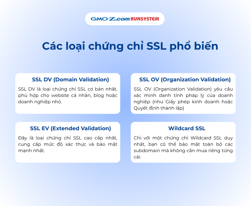 Không phải tất cả chứng chỉ SSL đều giống nhau, tùy vào nhu cầu và quy mô website, bạn có thể chọn loại SSL phù hợp để cân bằng giữa bảo mật, chi phí và uy tín thương hiệu. Dưới đây là các loại SSL Certificate phổ biến mà TENTEN đang cung cấp, giúp bạn dễ dàng lựa chọn gói phù hợp nhất.