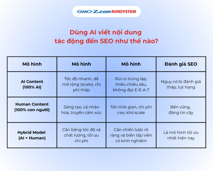 AI Content (100% AI) | Tốc độ nhanh, dễ mở rộng (scale), chi phí thấp | Rủi ro trùng lặp, thiếu chiều sâu, không đạt B-E-A-T | Nguy cơ bị đánh giá thấp, tụt hạng |