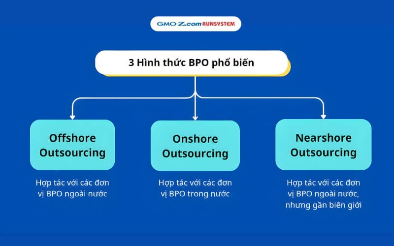 Nearshore BPO: Doanh nghiệp thuê ngoài từ các quốc gia lân cận về địa lý. Hình thức này mang tính trung hòa, cân bằng giữa chi phí và khả năng phối hợp nhờ múi giờ gần và sự tương đồng về văn hóa, phù hợp với những doanh nghiệp cần làm việc chặt chẽ nhưng vẫn muốn tối ưu ngân sách.